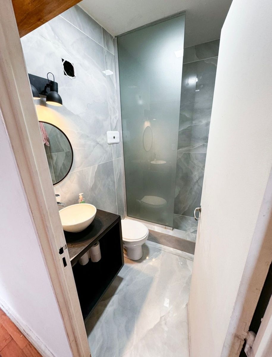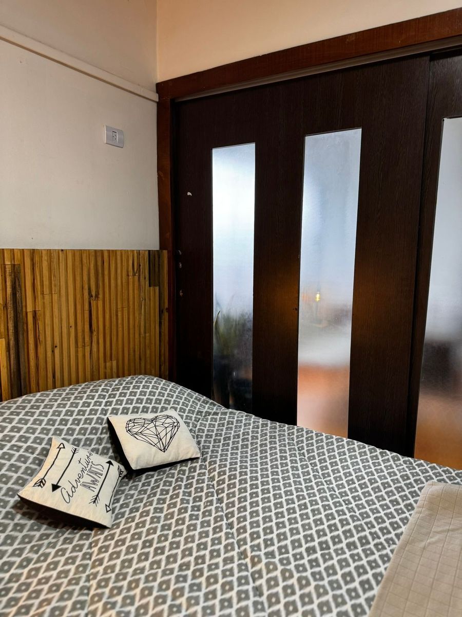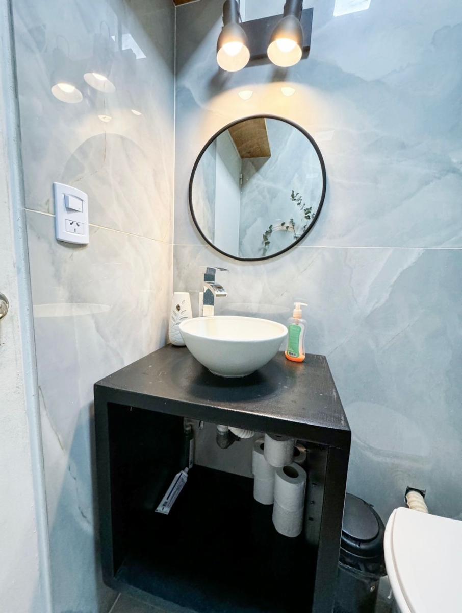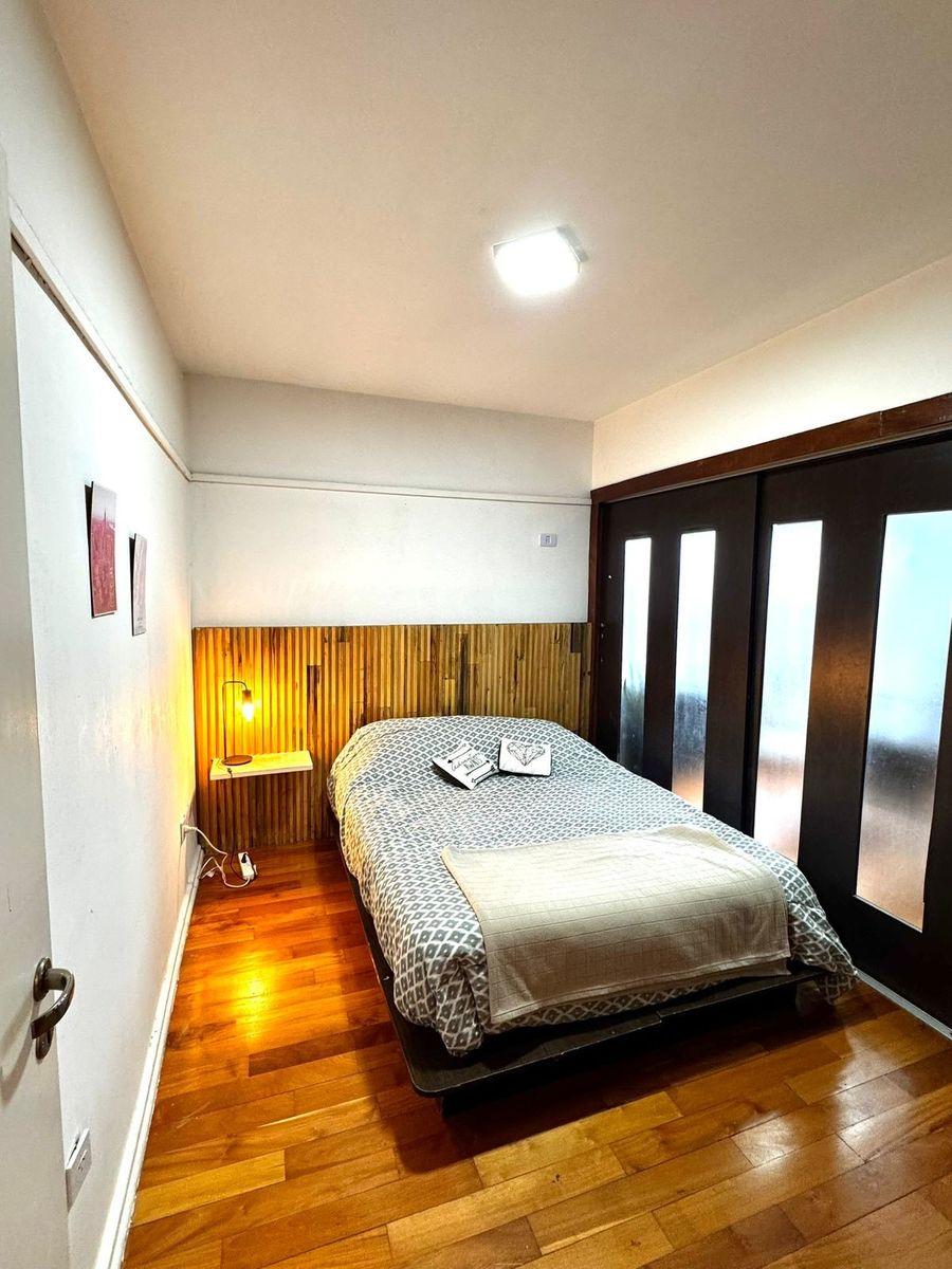 El dormitorio principal es amplio y luminoso, con pisos de madera y un diseño cálido. El baño se encuentra completamente renovado, con revestimientos modernos, ducha con mampara y griferías nuevas.