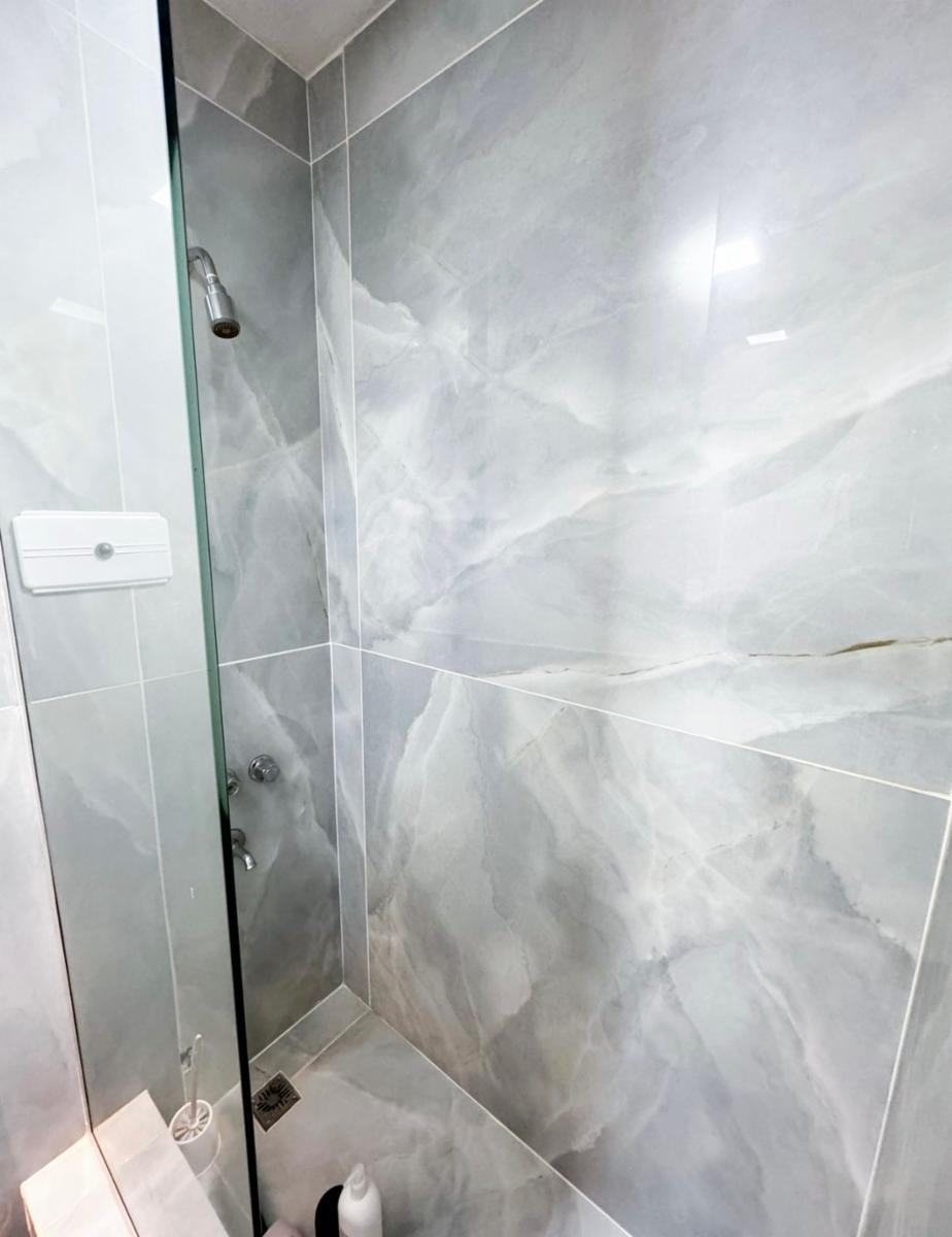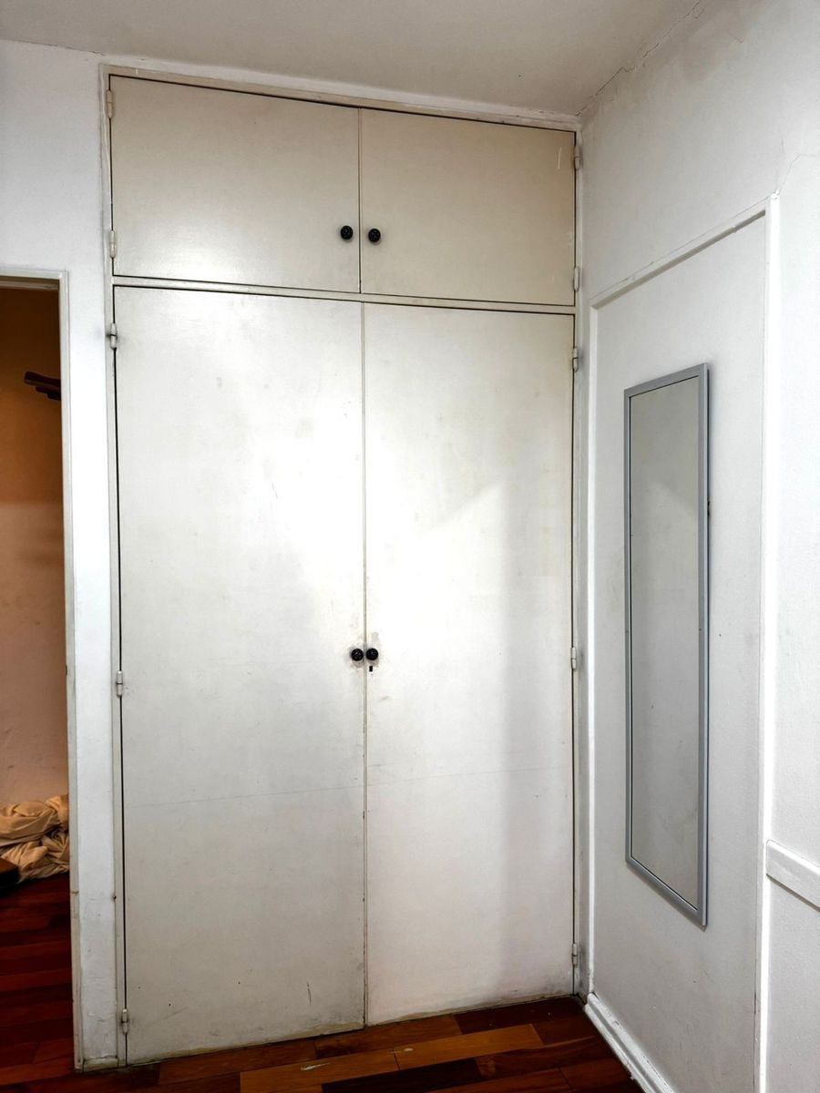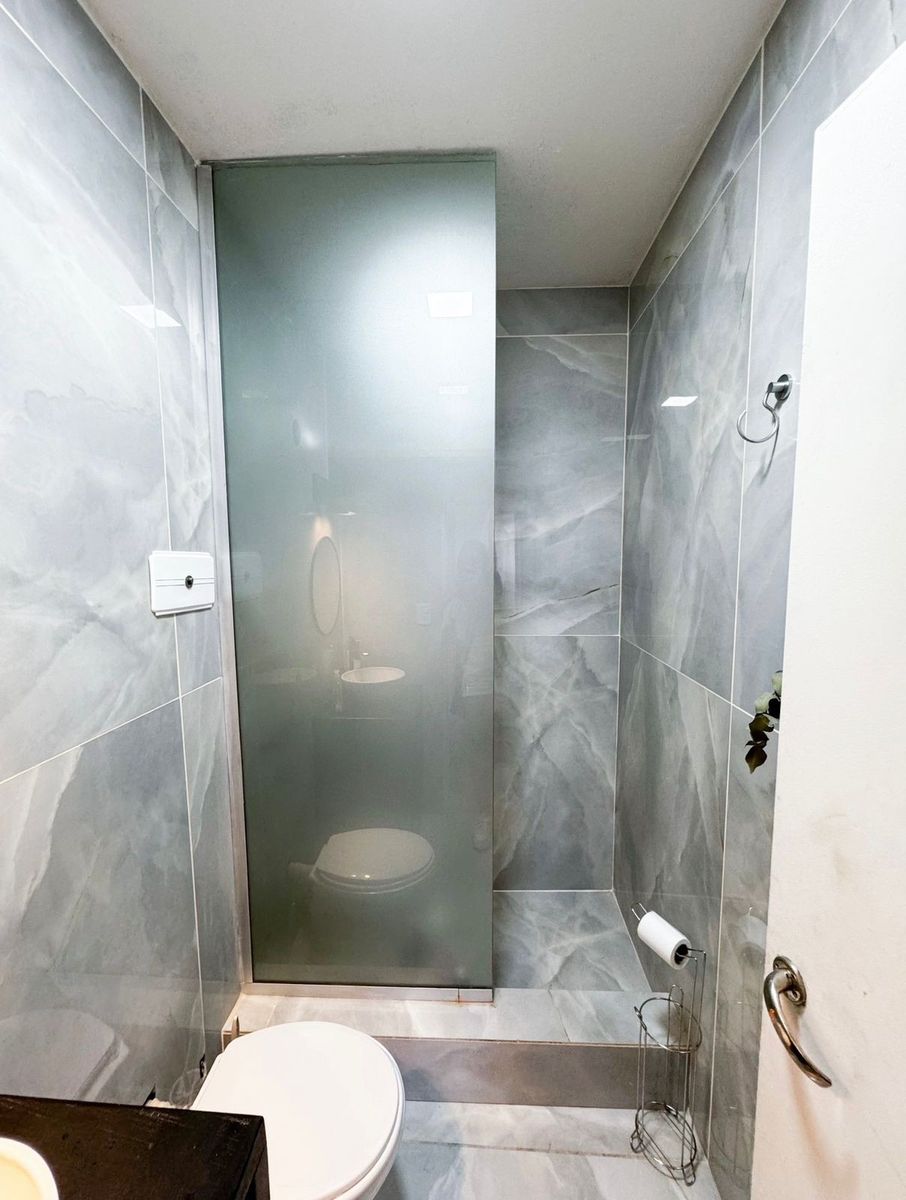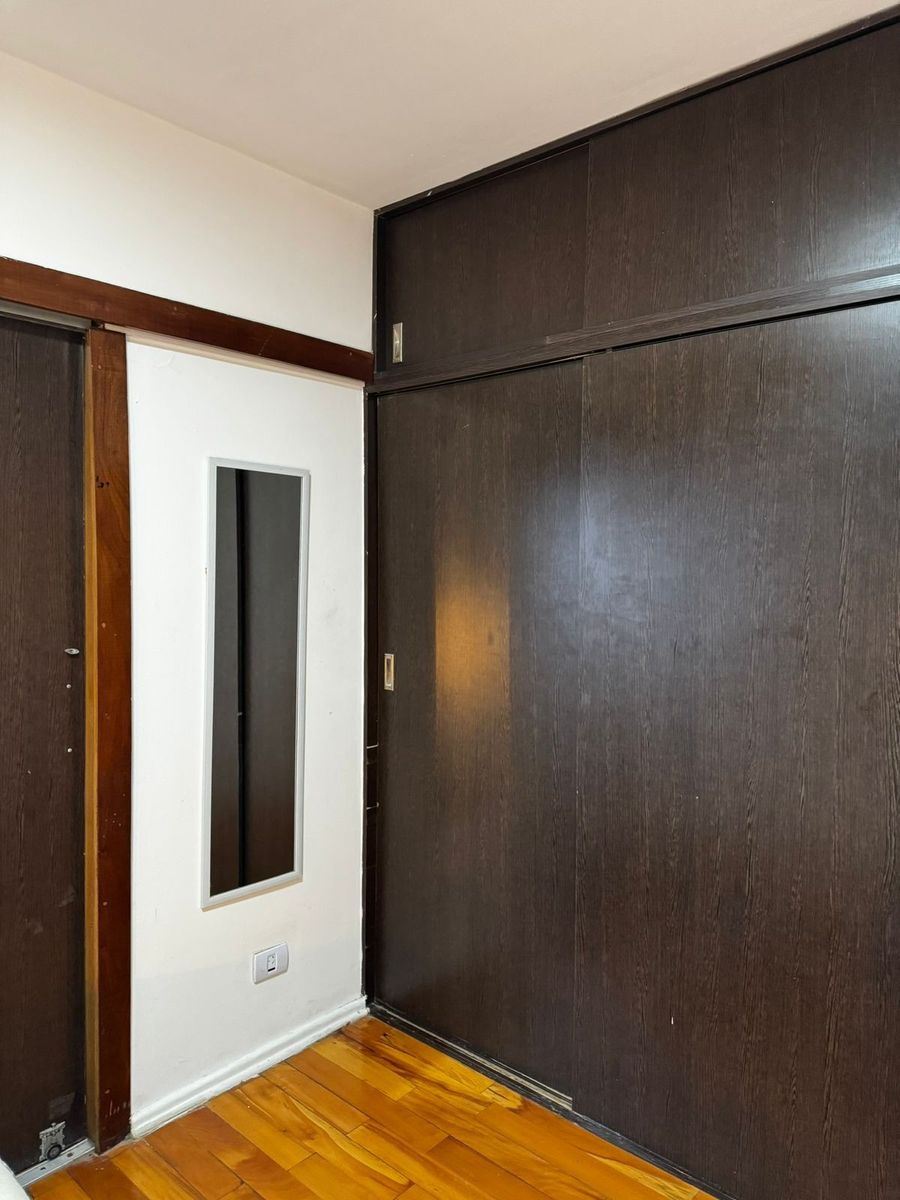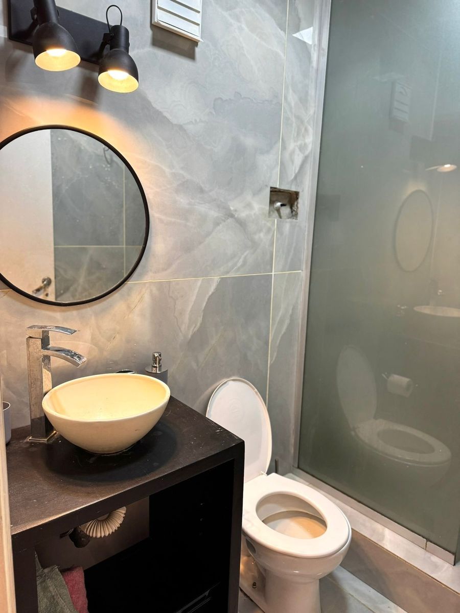 El dormitorio principal es amplio y luminoso, con pisos de madera y un diseño cálido. El baño se encuentra completamente renovado, con revestimientos modernos, ducha con mampara y griferías nuevas.