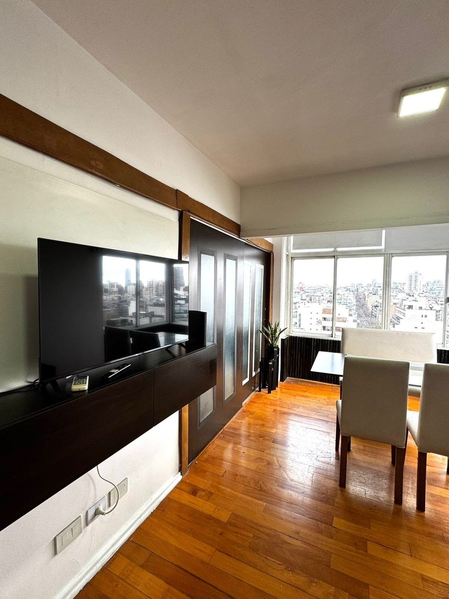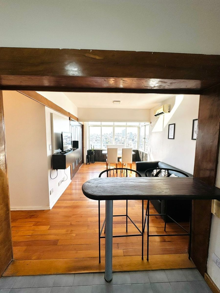 La unidad cuenta con un amplio living comedor con ventanales de piso a techo que ofrecen una vista despejada única de la ciudad. El sector de comedor vidriado funciona como un ambiente destacado, ideal para disfrutar del sol y la amplitud visual durante todo el día. Pisos de madera en muy buen estado y aire acondicionado en el área social.