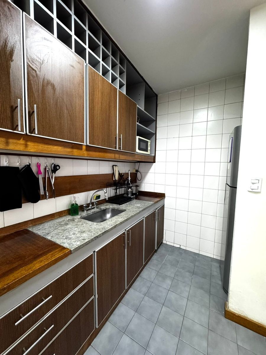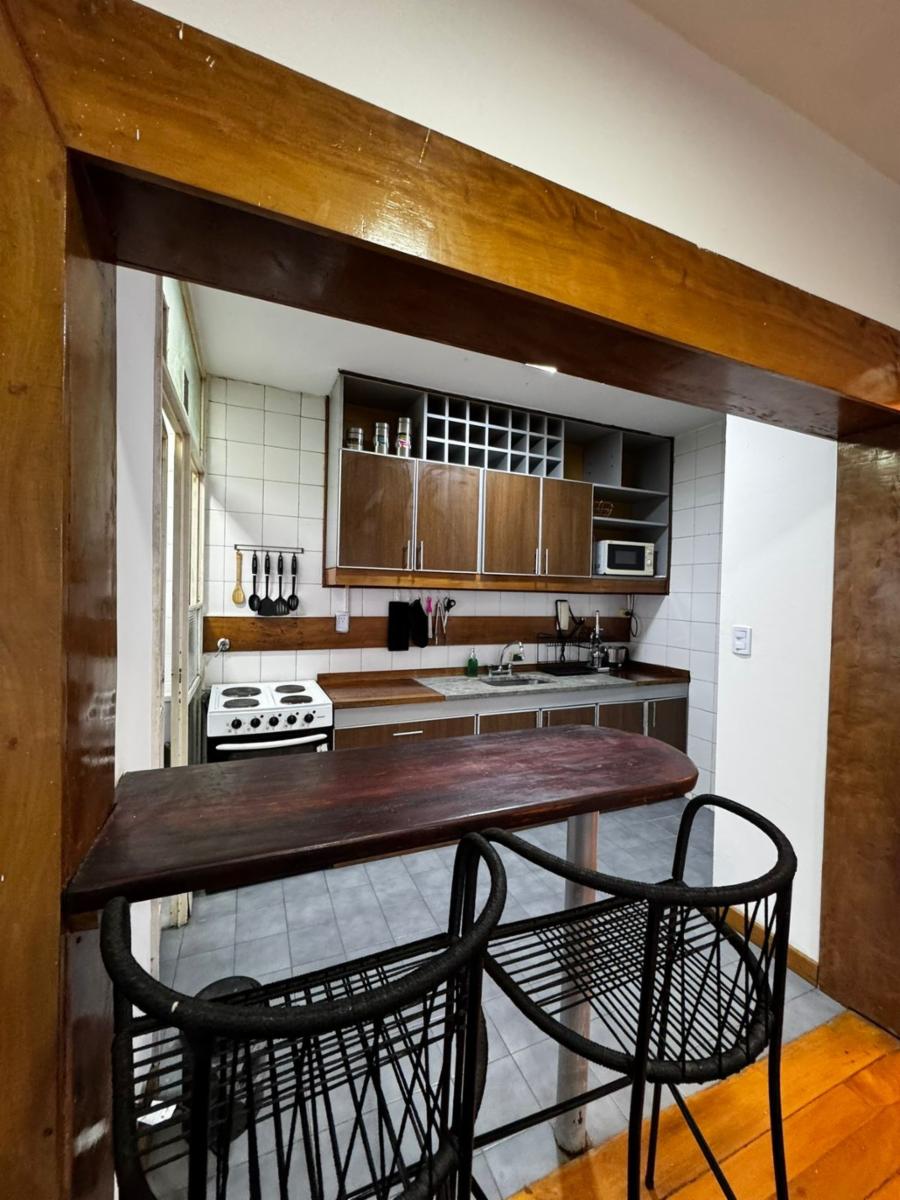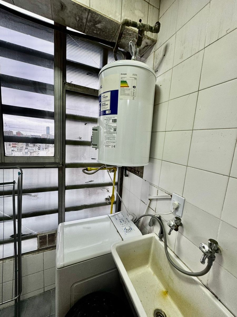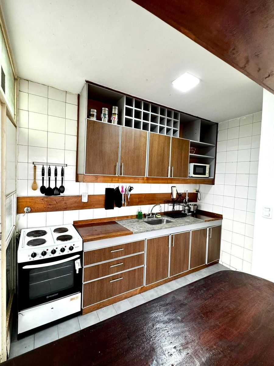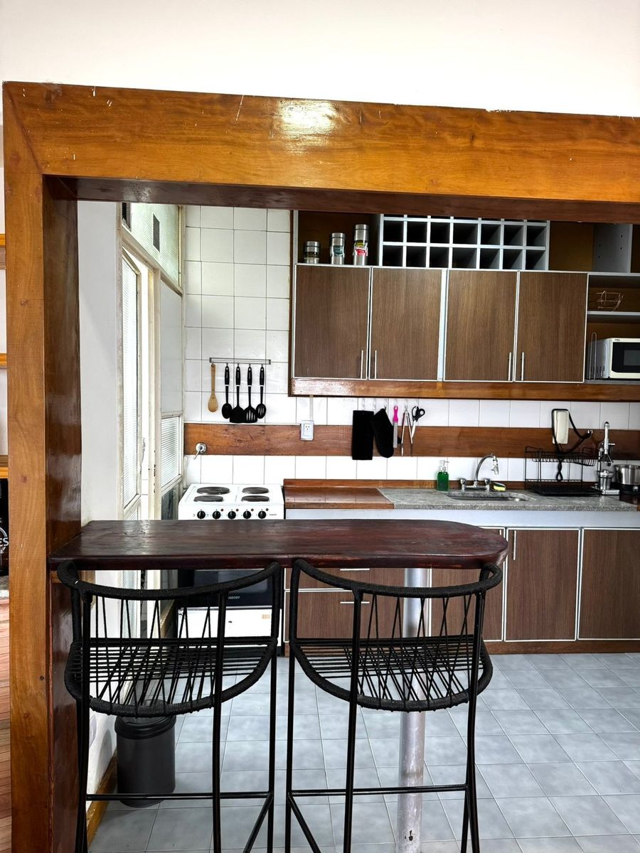 La cocina integrada presenta una barra funcional y se conecta con un lavadero independiente muy cómodo, equipado con lavarropas y termotanque nuevo.