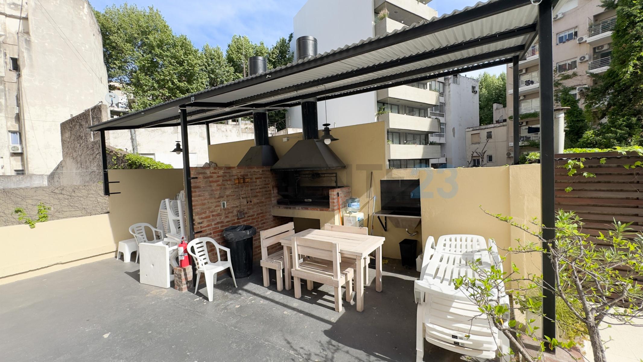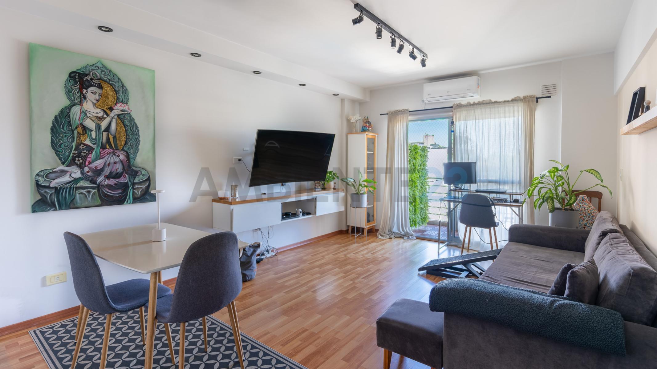 Hermoso y amplio departamento de 2 ambientes APTO CRÉDITO, en excelente estado. Ubicado en un noveno piso al contrafrente con vista amplia al pulmón, se destaca por su gran luminosidad, tranquilidad y excelente distribución. Al ingresar, encontramos un amplio y living con cocina integrada con barra desayunadora y salida a un balcón aterrazado amplio, el cual cuenta con red de protección. La cocina tiene buen espacio de guardado, ocultando la heladera y con espacio y conexión para lavarropas, resultando realmente práctica. El dormitorio, cómodo con orientación también al contrafrente, posee un vestidor super práctico con buen espacio de guardado. Todos los pisos son de madera y al igual que toda la unidad, se encuentran en excelente estado de conservación. Cabe destacar que la instalación eléctrica fue hecha totalmente a nuevo, junto con parte de la iluminación del living y cocina. El edificio cuenta con seguridad hasta las 4am, seguridad por totem, SUM, Pileta con solarium y sector de parrillas en el pulmón de manzana. Hay cocheras y bauleras diponibles para alquilar en el edificio.